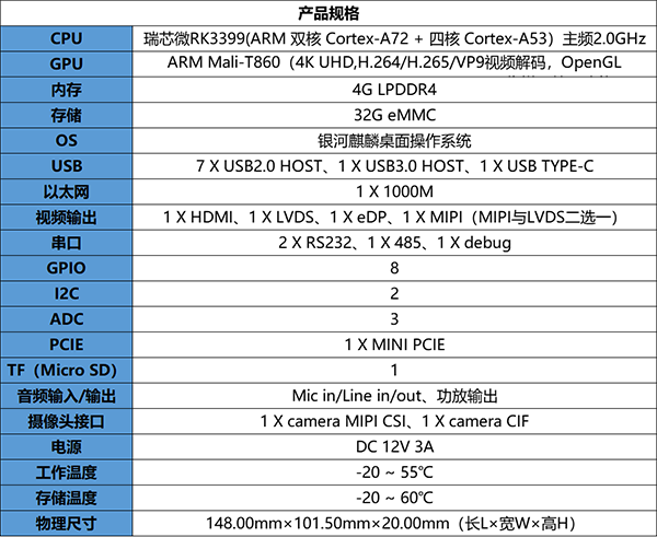 1、CPU采用瑞芯微RK3399(雙核 Cortex-A72 + 四核 Cortex-A53)主頻2.0GHz;